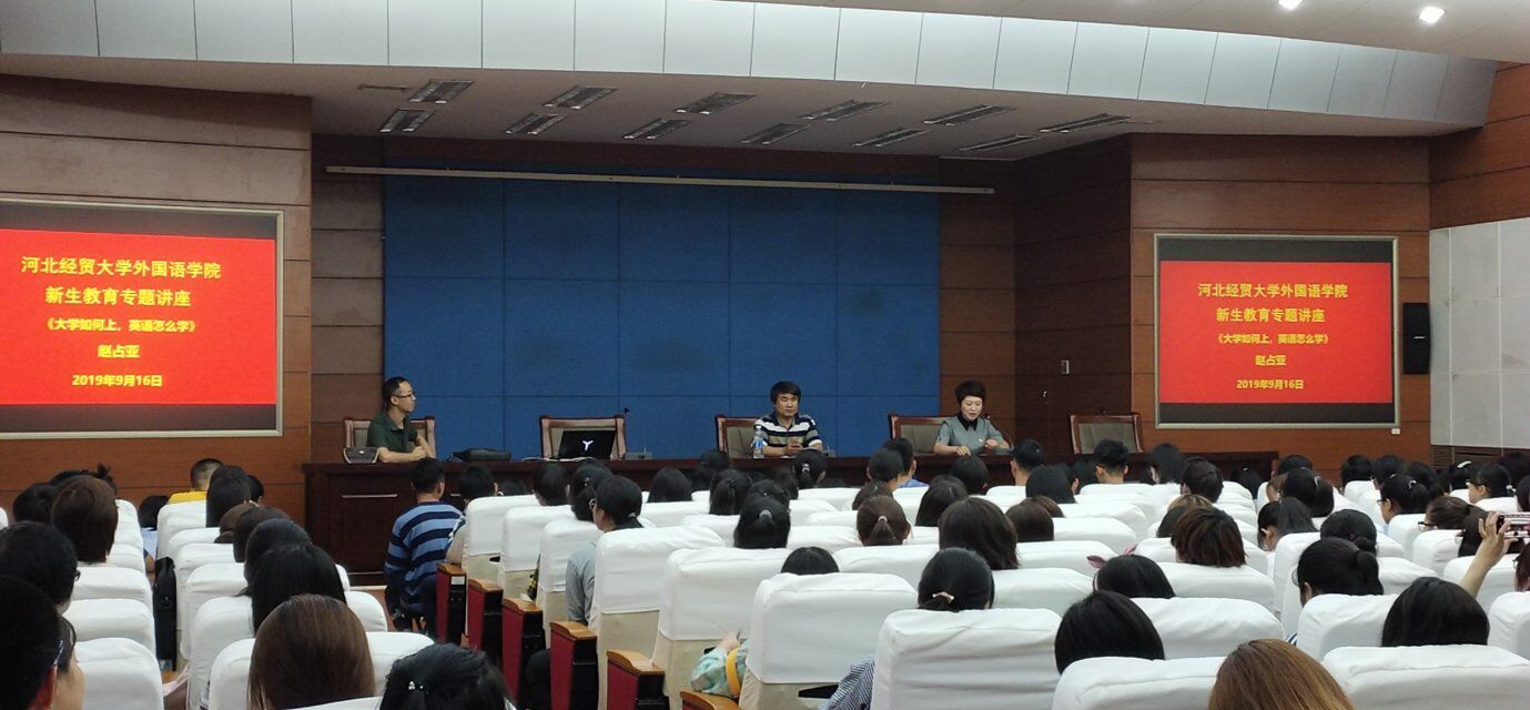 9月16日下午,正规滚球app平台官网在会议中心视频会议室举办新生教育专题讲座。正规滚球app平台官网经济管理学院文法系主任赵占亚应邀主讲,学院党委书记、副书记及2019级全体新生230余人到场聆听。