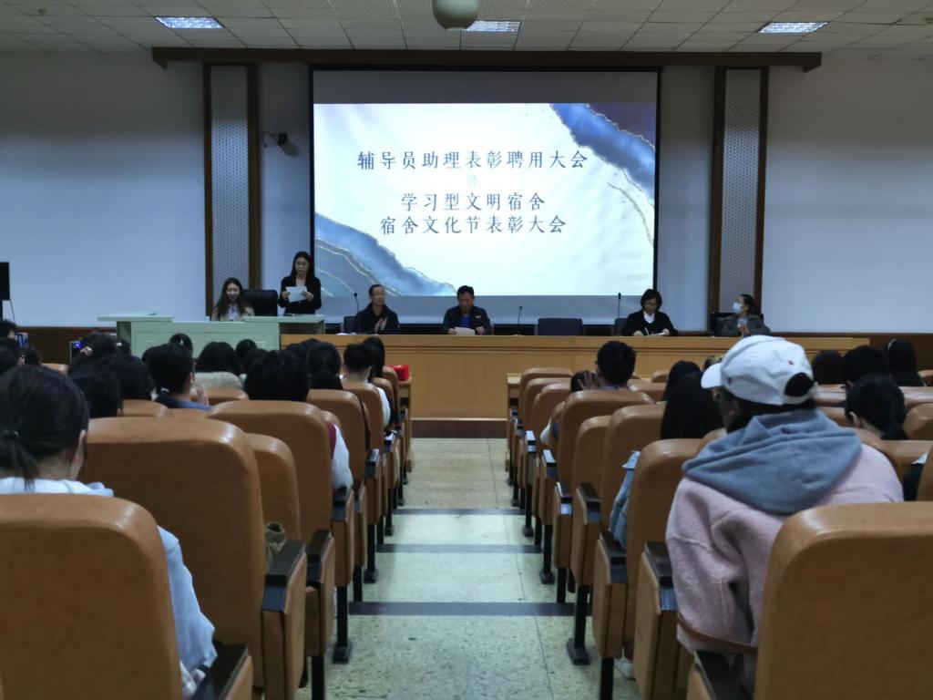 11月13日中午,正规滚球app平台官网于第三教学楼C区201举办辅导员助理表彰聘用大会暨学习型文明宿舍及宿舍文化节表彰大会。党委书记刘会娟、院长商利伟、书记刘磊、团委书记李维婷与冯晓伟等领导亲临活动现场。全体大一新生及大二、大三部分学生代表到场聆听。