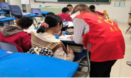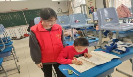 上课铃声响起,志愿者们组织中、小学生就坐学习,维持教室纪律,并利用自己的专业知识为他们答疑解惑。