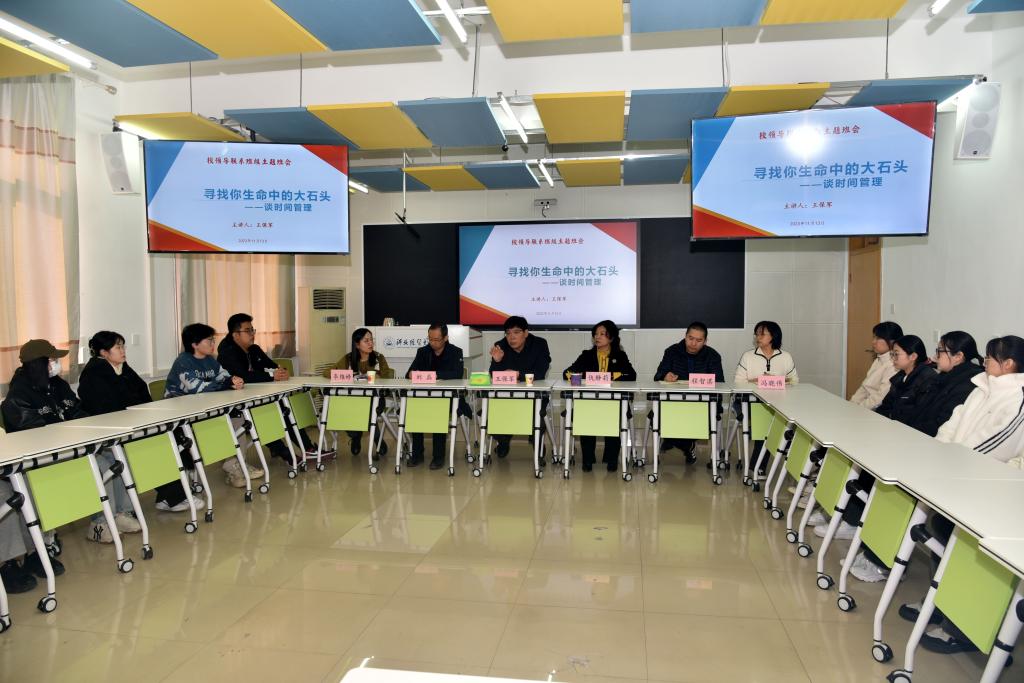 本次班会主题为:寻找生命中的大石头 — 谈时间管理,班会主旨是让大一新生尽快适应大学生活,学会自我管理时间的能力。同学们结合个人经历,依次分享了入学以来的感受、学习中遇到的困惑,以及对自己时间管理能力的反思。分享完毕后,王保军分别给予评价与反馈,并对同学们基本适应了大学生活表示欣慰,对团结友爱的班级氛围表示肯定。