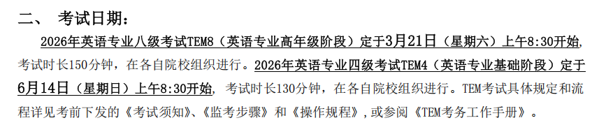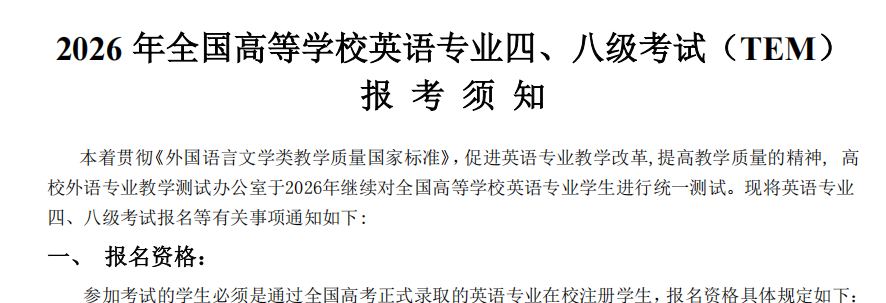 2026年全国高等学校英语专业四级、八级考试报考须知